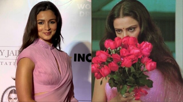 Alia donned the celebratory look for the special screening of Rekha’s movie Umrao Jaan in Mumbai. Rooted in tradition yet unmistakably modern, the classic fluid Tarun Tahiliani saree was paired with a fluted blouse featuring raffia detailing on the collar. The style draws inspiration from the saree Rekha wore in the film Silsila. Rhea posted an image of Rekha in the pink saree on Instagram.